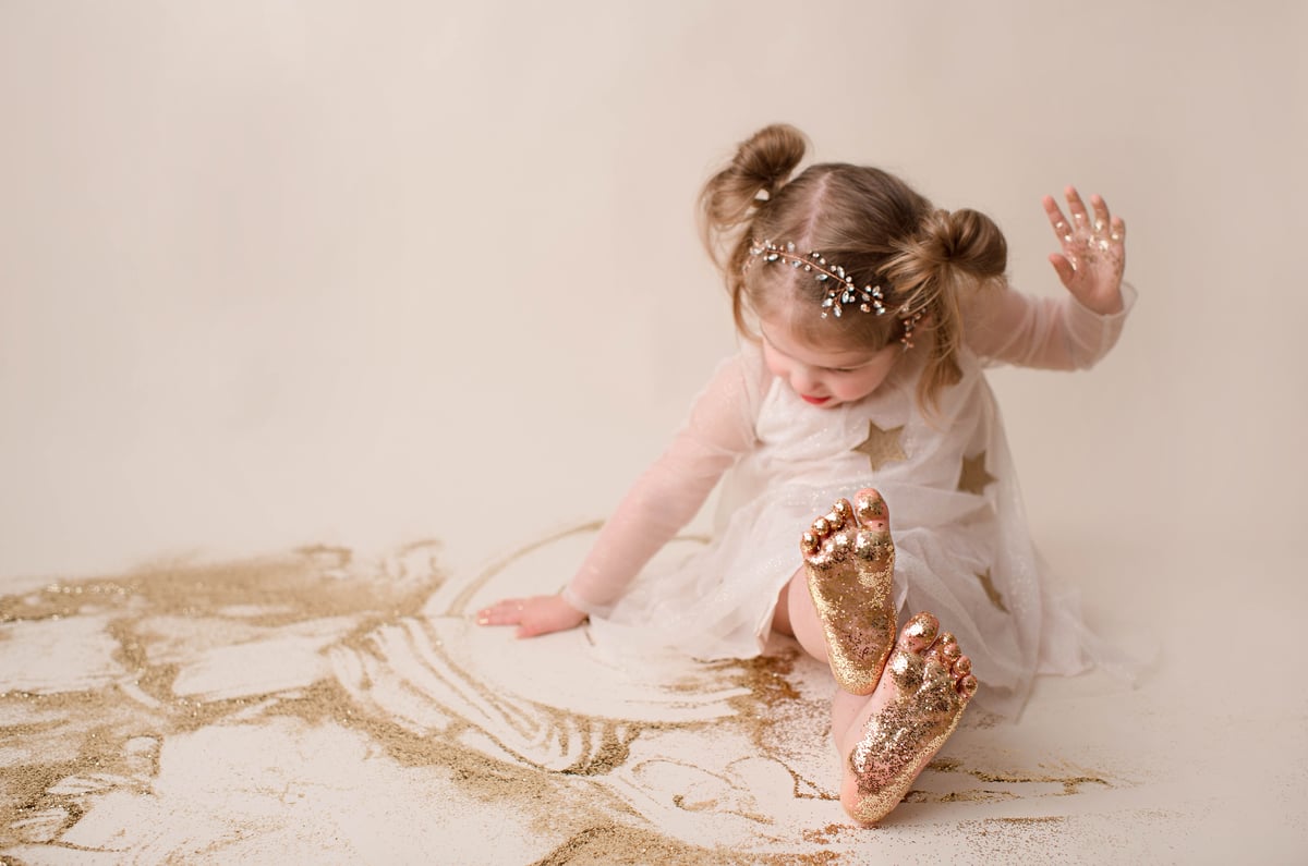 The session will feature gold glitter on a cream colored backdrop (same as in example photos) Wardrobe options offered! **Please specify Childs size in notes when checking out!!**